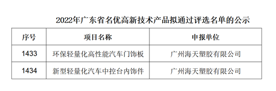 为不断提升公司产品实力,广州海天塑胶有限公司积极参与2022年广东省名优高新技术产品评选。公司“环保轻量化高性能汽车门饰板、新型轻量化汽车中控台内饰件”2项产品于2022年12月30日顺利获评“广东省名优高新技术产品”。后续,我们将再接再厉推出更多优质产品,感谢大家对海天的关注与支持!