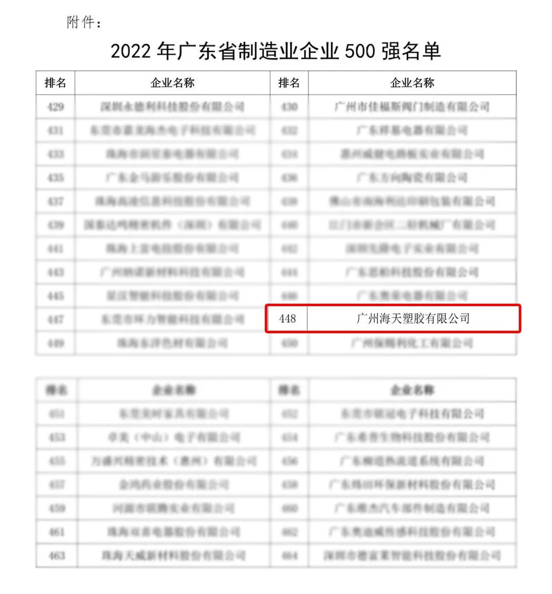12月28日,2022年广东省制造业发展年会暨广东省制造业500强企业峰会在广州隆重举行,会上发布了2022年广东省制造业500强企业名单,广州海天塑胶有限公司荣耀上榜。
